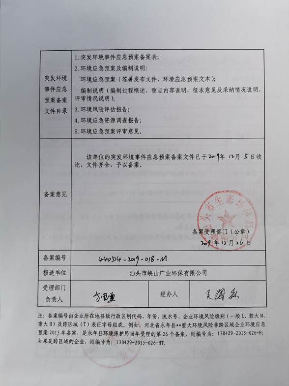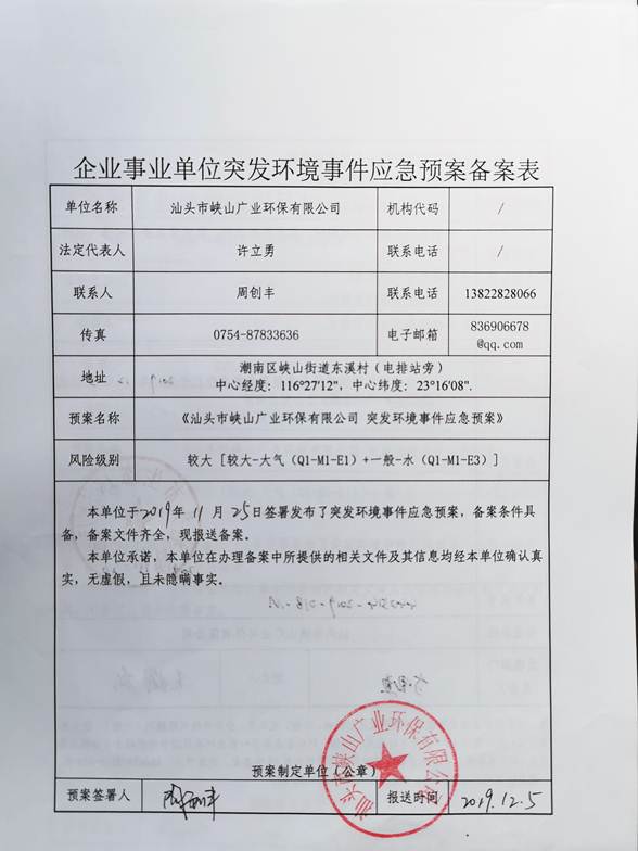 1、單位名稱: 汕頭市峽山廣業(yè)環(huán)保有限公司